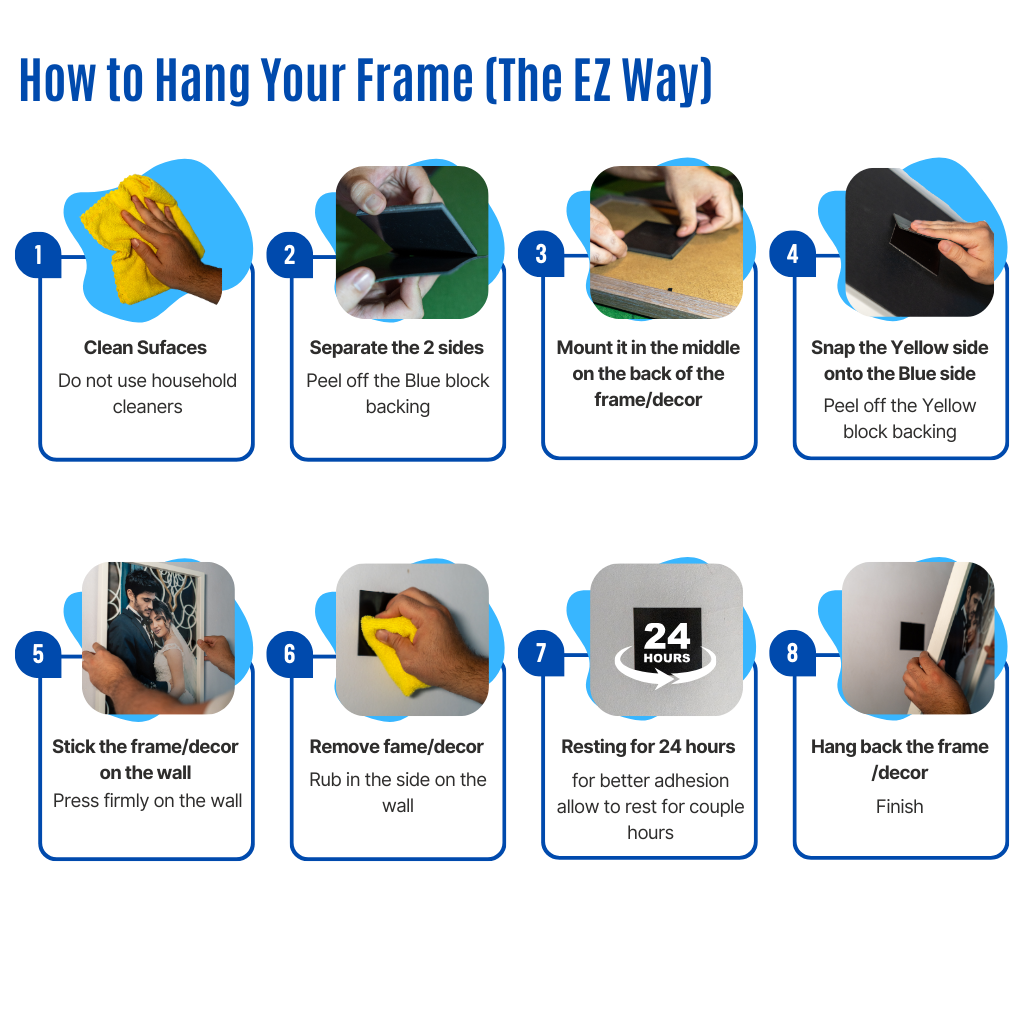 Peel tape from Side B and place frame on wall and press. Remove frame and rub side B into wall